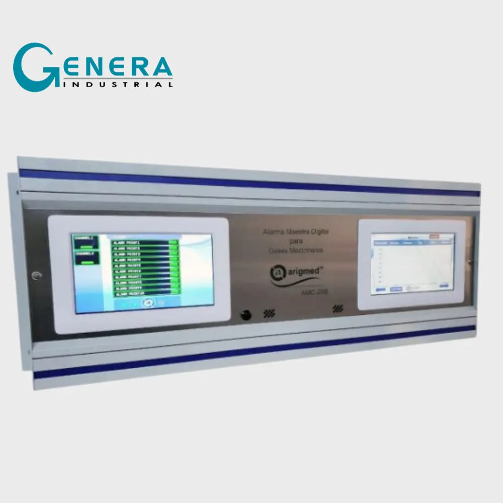 Alarma Maestra Combinada, con una alarma de panel maestro de Relé SERIE 2 y una alarma de panel maestro para vigilancia de grupos de alarmas de zona SERIE 2, cumple con NFPA9S, sólo disponible en gabinete de sobreponer a muro. Gabinete de Montaje:+ Gabinete fabricado en perfiles de aluminio de extrusión especial aleación 6063 temple 5 en acabado de pintura electrostática horneada. + Sólo para “Sobreponer” en muro. Capacidad: + Alarma Panel Maestro de Relé: 10 señales como mínimo y 40 señales como máximo.+ Alarma Panel Maestro para vigilancia de Alarmas de Zona: de 1 y hasta 100 alarmas de zona indistintamente el numero de módulo de gases médicos que contenga cada alarma de zona. Gráficos: “Alarma Panel Maestro de Relé:+ Destello de Alarmas en cada Señal indicando una consición "anormal". + Condición “Normal” en cada Señal (sin evento de alarmas). + Visualización del nombre de la señal en la pantalla táctil de 7”. Alarma Panel Maestro para vigilancia de Alarmas de Zona: + Visualización de lecturas de Presión y Vacío en tiempo Real de cada alarma de zona conectada a la alarma de panel maestro SERIE 2. +Color NFPA99 y Nomenclatura de cada gas medicinal de cada alarma de zona conectada a la alarma de panel maestro SERIE 2. + Destello de Alarmas en cada Módulo de Gas por cada alarma de zona conectada a la alarma de panel maestro SERIE 2.+Visualización del nombre del área donde se ubica cada alarma de zona conectada a la alarma de panel maestro SERIE 2. Eventos de Alarma: "Alarma Panel Maestro de Relé": + Detección delos eventos “anormales” en tiempo real de cualquier equipo o alarma conectado con a tecnología de comunicación de contactos secos o de Ralg.“Alarma Panel Maestro para vigilancia de Alarmas de Zona: + Alarma para la detección delos eventos de alta y baja presión en tiempo real. Comunicaciones: "Alarma Panel Maestro de Relé": + Módulos de 10 señales de puerto de Relé de contactos secos para salida de datos (con un máximo de 40 señales de puertos de Relé en múltiplos de 10). + Protocolo de comunicación RS485 en conexión SERIAL para enlace con grupos de alarmas de zona o con equipos con la tecnología de comunicación de contactos secos o de Relé. “Alarma Panel Maestro para vigilancia de Alarmas de Zona: + Puertos Hembra RJ45 para Salida y Entrada de datos. + Puerto de Relé de contactos secos para salida de datos (1 puerto). + Protocolo de comunicación RS485 en conexión SERIAL para enlace con grupos de alarmas de zona y con la interfaz Ethernet (Internet). + Conexión a INTRANET y EXTRANET (INTERNET) por medio de la INTERFAZ ETHERNET DE ARIGMED con HTML para visualizar el sistema con dispositivos remotos como PC, TABLET, SMARTPHONE vía sitio web. Funciones: "Alarma Panel Maestro de Relé": +Edición del Nombre de la señal. + Recomendado para enlace con centrales de suministro de gases medicinales (manifolds, tanques criogénicos y generadores de oxígeno). + Recomendado para enlace con Compresores de Alre y Bombas de Vacío grado módico. “Alarma Panel Maestro para vigilancia de Alarmas de Zona":+ Edición del Nombre del área donde se ubicará la alarma de zona.+ Generación de reportes para eventos de alarma de todo el sistema en archivos de exportación en formatos PDF (Acrobat Reader) y XLS (Excel) con un tiempo de almacenamiento.