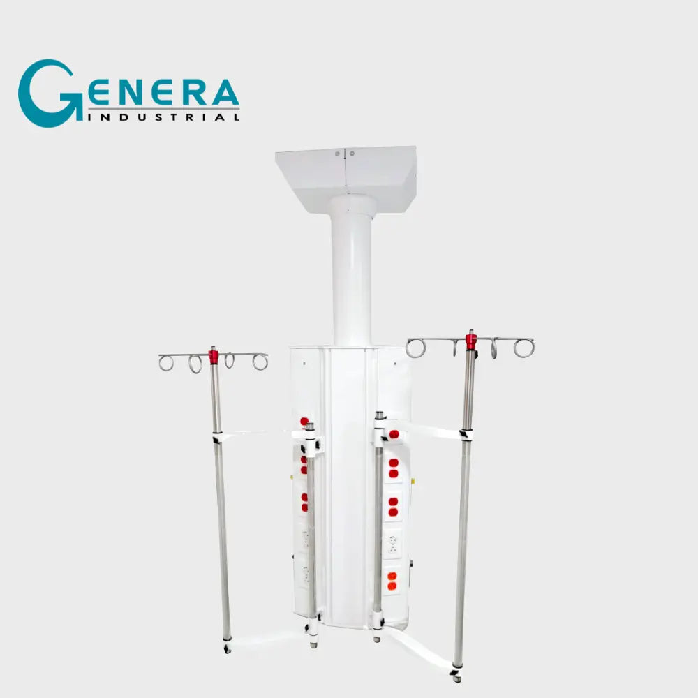Brazo médico cielítico giratorio en su propio eje Serie Arigmed para la organización de Gases médicos, eléctricos, soportes para equipo médico auxiliar, sistemas de datos para optimizar el espacio en las zonas de pacientes de cuidados intensivos, con movimiento giratorio sobre su mismo eje, mejora la atención médica por medio del posicionamiento de las tomas de gases médicos y tomas eléctricas, incluye mangueras de gas médico pre-montadas, cableado eléctrico, voz y datos.
