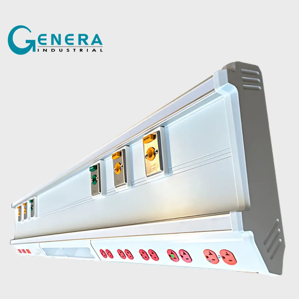 Cabecero de Paciente Horizontal de 4 vías internas para instalaciones y 1 vía posterior oculta (5 vías totales) con separaciones en estado sólido. Incluye rieles de servicio horizontales superior e inferior para montaje y deslizamiento de equipo médico auxiliar. Modelo de gran capacidad interna para instalaciones y montaje de dispositivos de servicio.