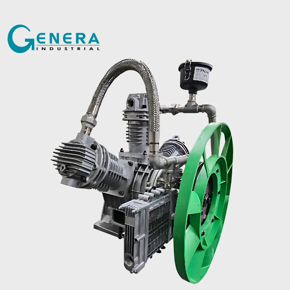 Compresor reciprocante (pistón) 100% libre de aceite de una y dos etapas, diseño mejorado y eficiente para aplicaciones especiales que requieran aire exento de aceite, de transmisión por poleas y bandas, fabricado en materiales de ingeniería para reducir el peso y aumentar la resistencia mecánica (inyección de aluminio y acero), ensamblado en México.