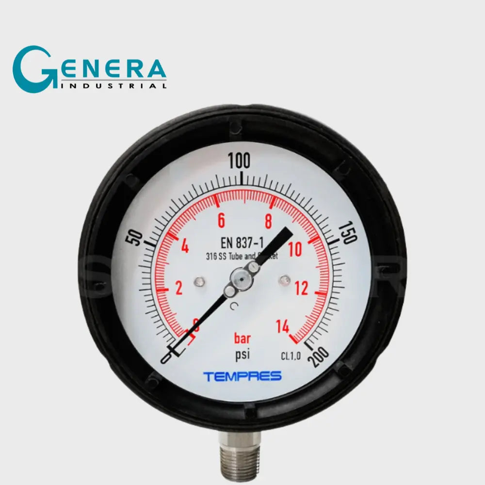 Este manómetro de la Serie Inox con diámetro de 100 mm (4") cuenta con caja de resina fenólica, ideal para aplicaciones industriales que requieren alta resistencia térmica y química. Su conexión inferior de 1/2" NPT macho y componentes internos en acero inoxidable SS316 garantizan durabilidad y excelente comportamiento en ambientes agresivos. Con un rango de medición desde 0 a 15000 psi, puede operar hasta +200 °C en versión seca, hasta +60 °C cuando está lleno con glicerina estándar, y hasta +200 °C con glicerina especial para alta temperatura. Ideal para procesos de baja presión en condiciones exigentes.