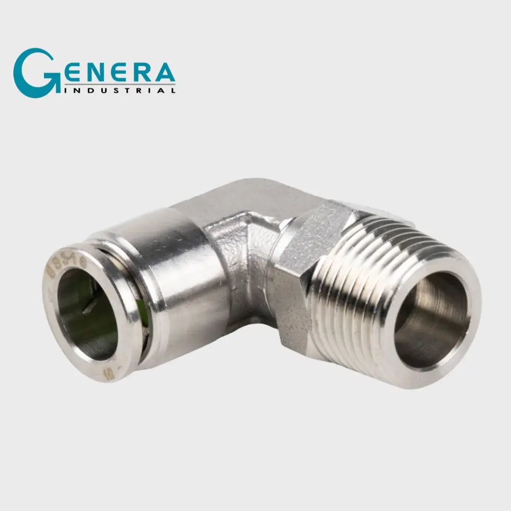 Este racor rápido codo macho está diseñado para realizar conexiones seguras en sistemas de tuberías, permitiendo un cambio de dirección de 90° sin comprometer el flujo. Fabricado en acero inoxidable 316 (SS316), ofrece una alta resistencia a la corrosión y durabilidad en aplicaciones exigentes.
