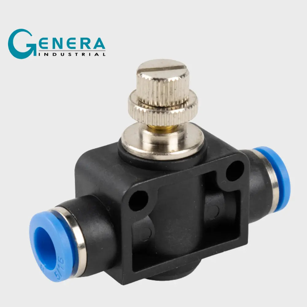 Este racor rápido con válvula reguladora de paso recto está diseñado para controlar y ajustar el flujo de forma precisa en sistemas de tuberías. Su diseño lineal permite una regulación eficiente sin alterar el recorrido del conducto.