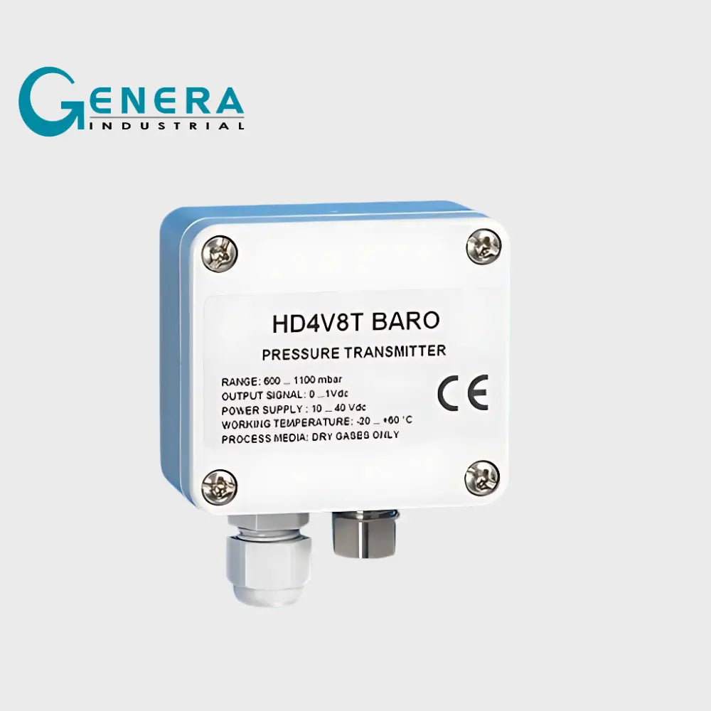 Rango de medición 600…1100 mbar. Alimentación 10…40 Vdc. Temperatura de trabajo -30°C…60°C. Dimensiones de la carcasa 60 x 66 x 35 mm.